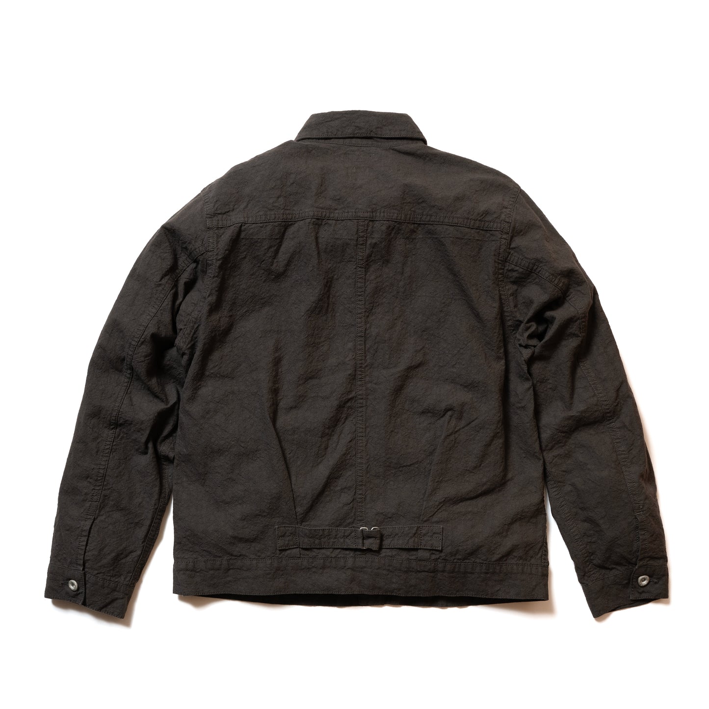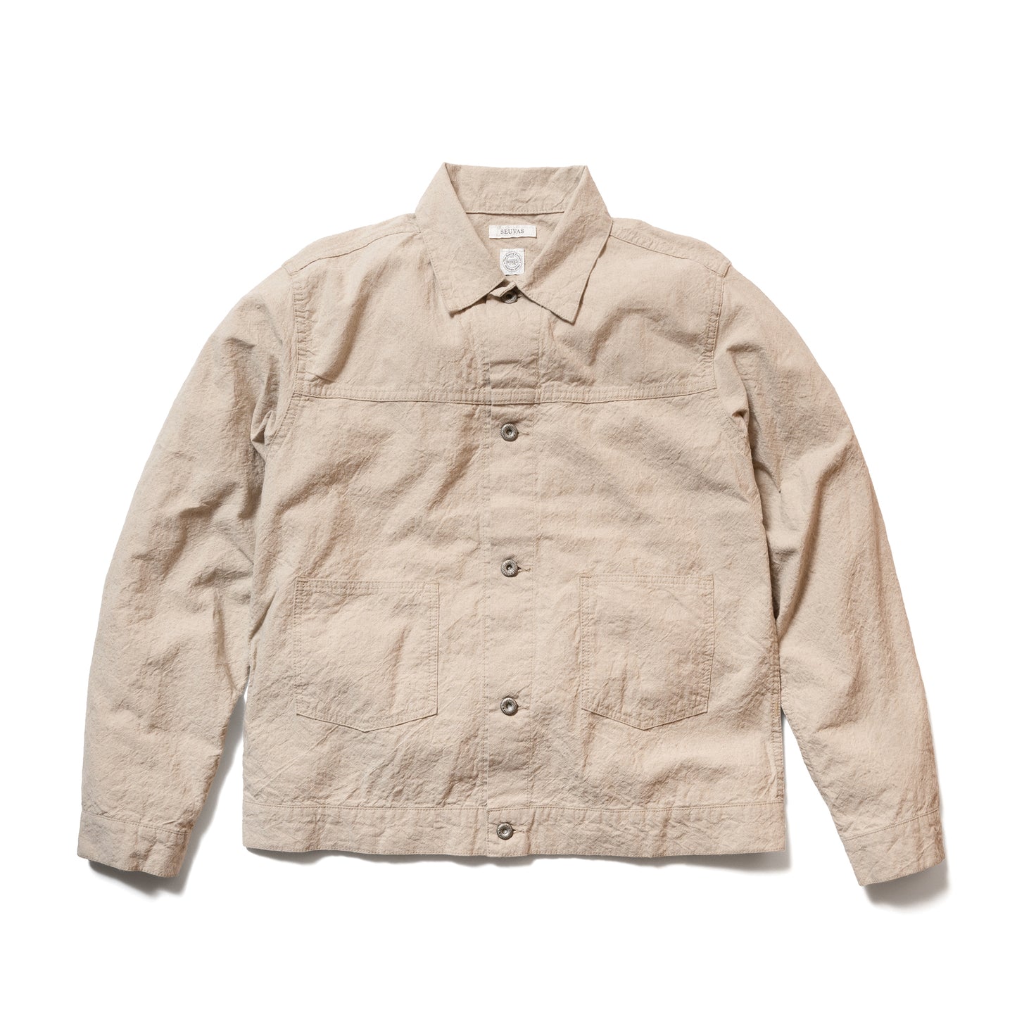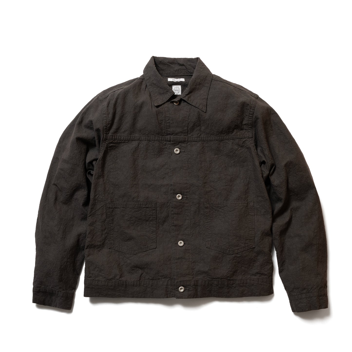 コットンリネン生地使用したスタンダードシルエットのトラッカージャケットです。縦糸、緯糸にコットンとリネンの混紡糸を使用し、高密度に織り上げました。コットンとリネンそれぞれの良さを最大限に活かした風合いが特徴です。日本国内で染色を行い、天日乾燥仕上げによる自然なシワ感が、ジャケットの雰囲気をより一層引き立てています。同素材のパンツの展開があります。