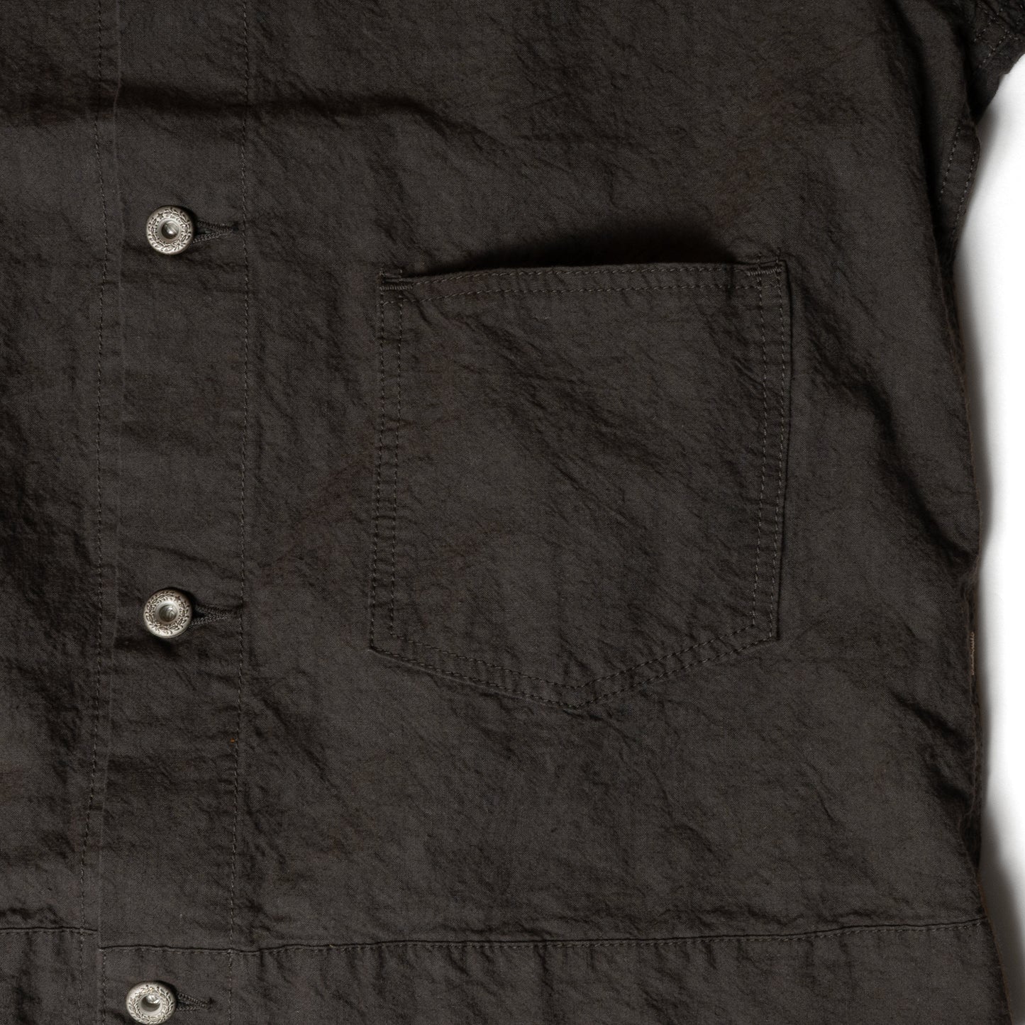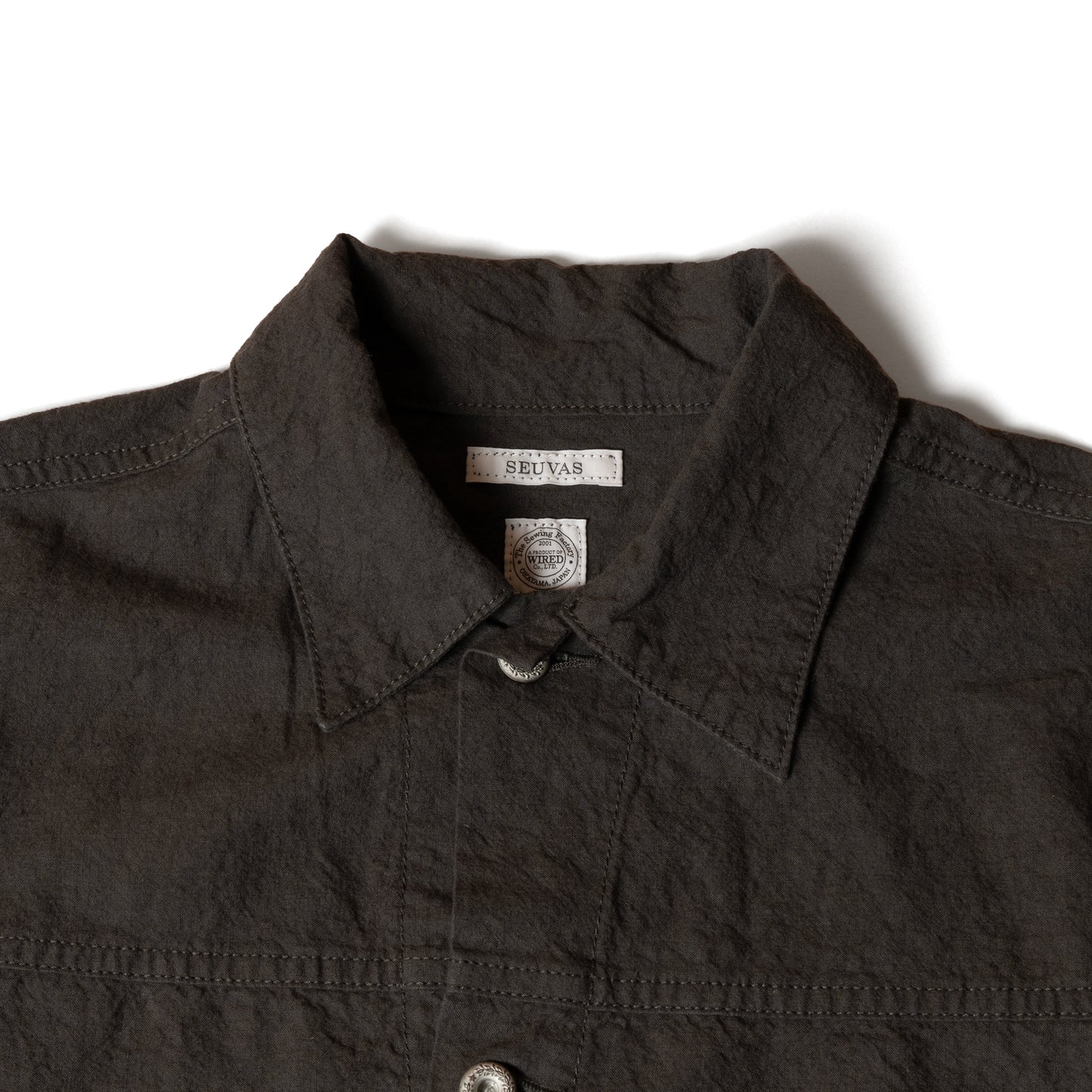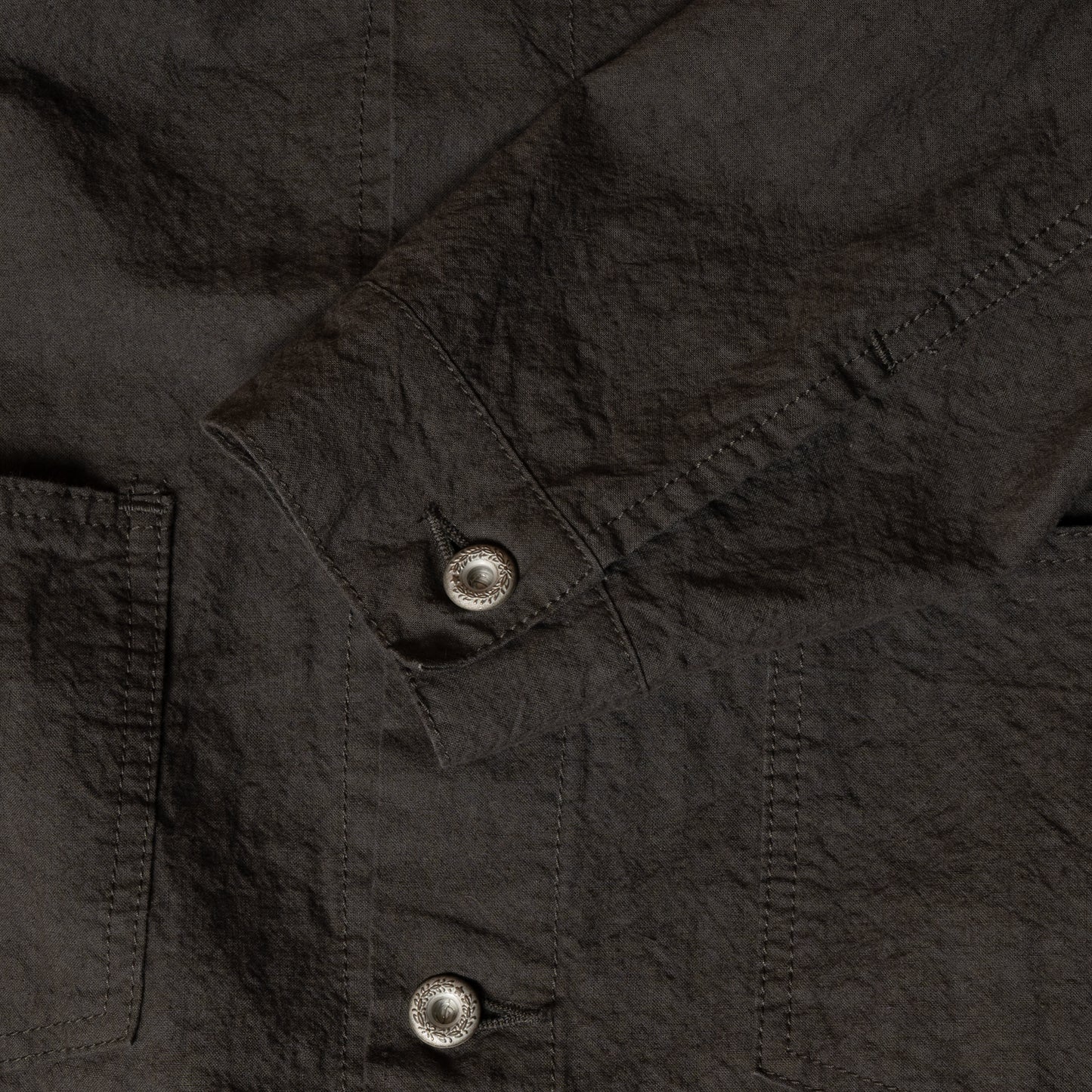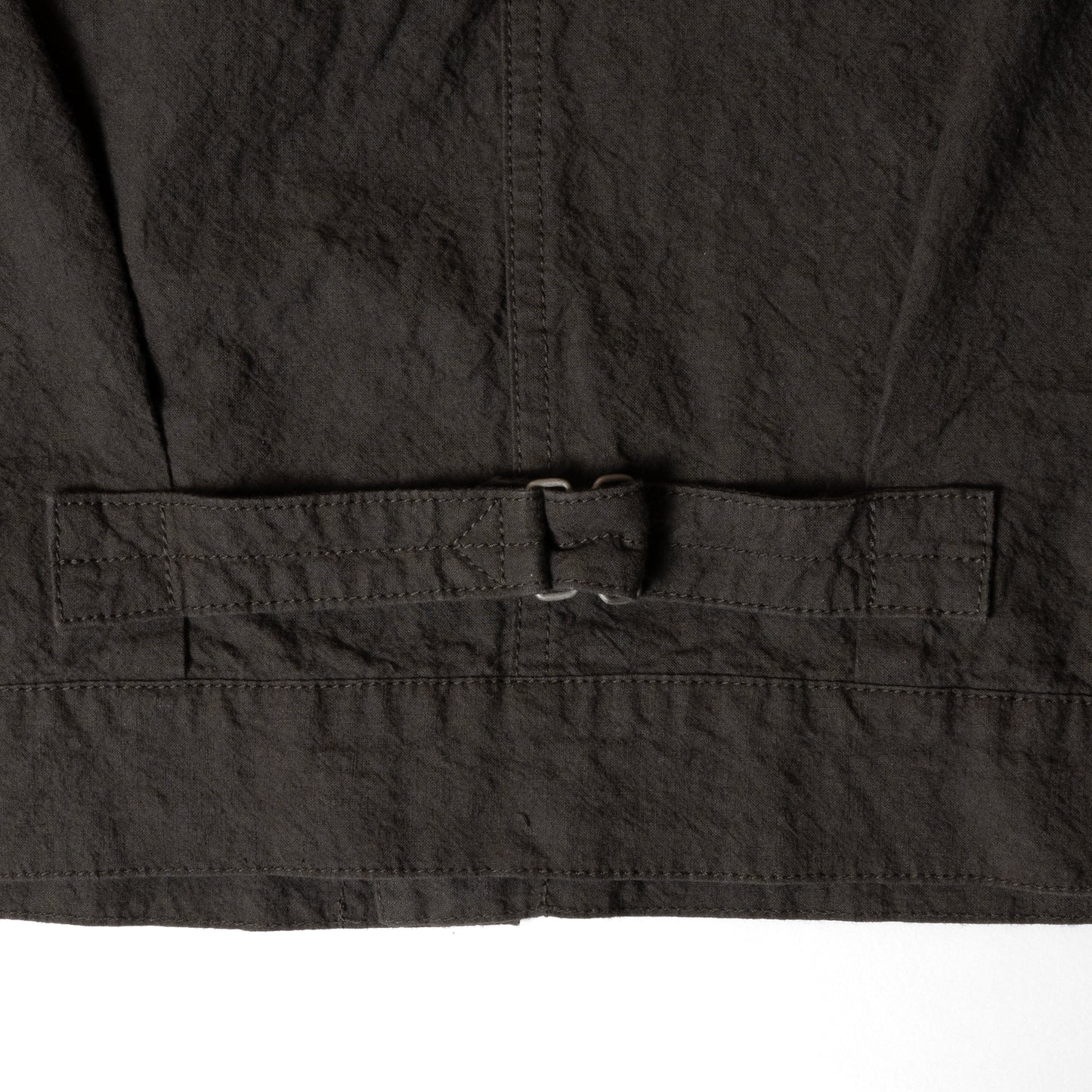 コットンリネン生地使用したスタンダードシルエットのトラッカージャケットです。縦糸、緯糸にコットンとリネンの混紡糸を使用し、高密度に織り上げました。コットンとリネンそれぞれの良さを最大限に活かした風合いが特徴です。日本国内で染色を行い、天日乾燥仕上げによる自然なシワ感が、ジャケットの雰囲気をより一層引き立てています。同素材のパンツの展開があります。
